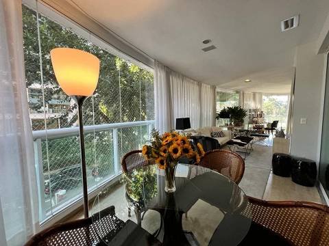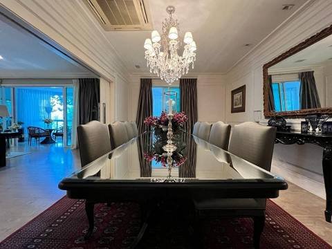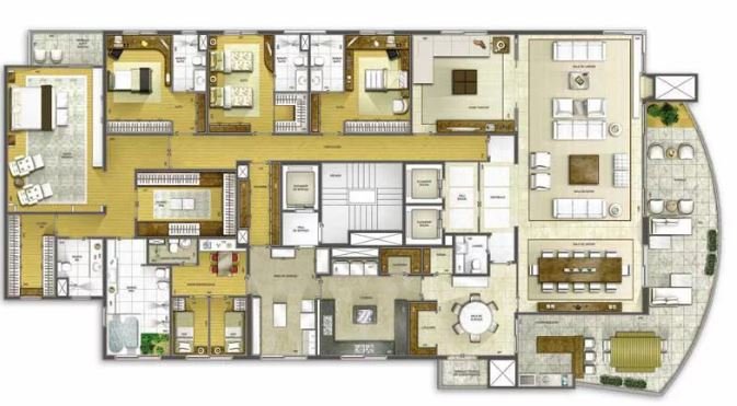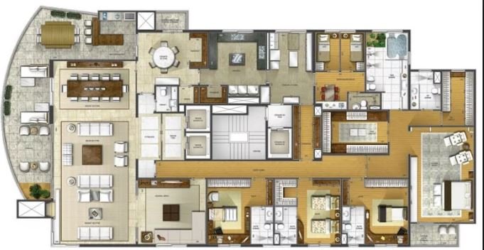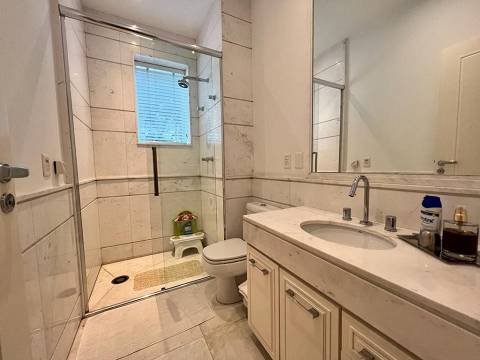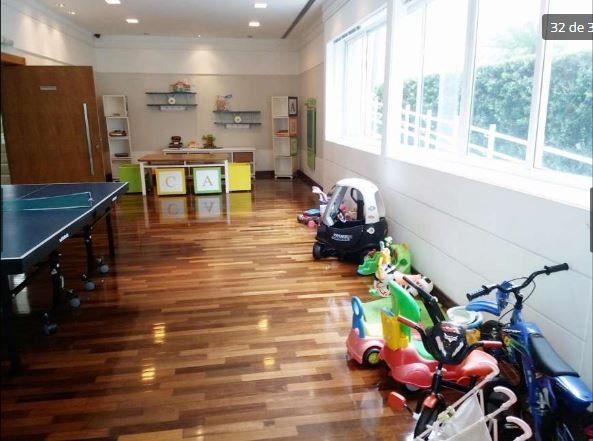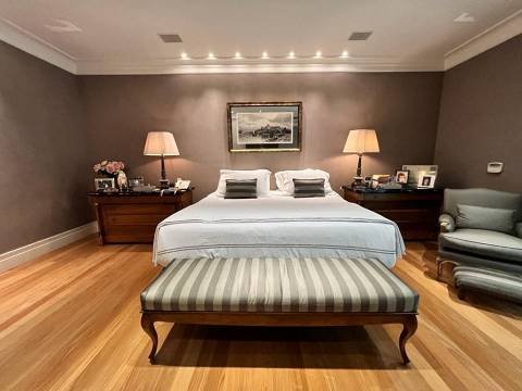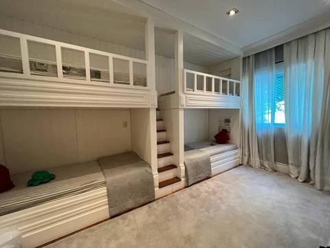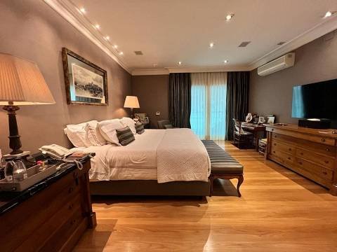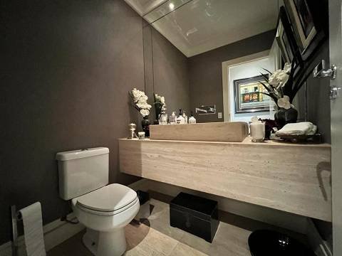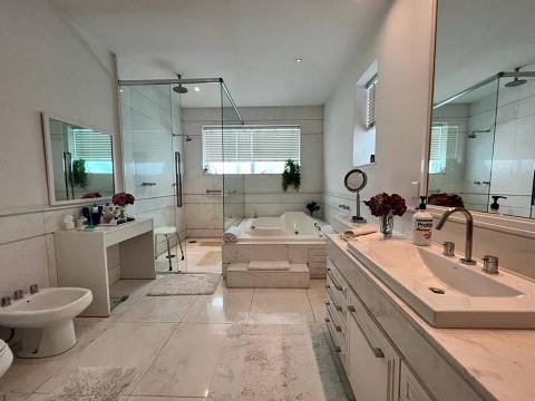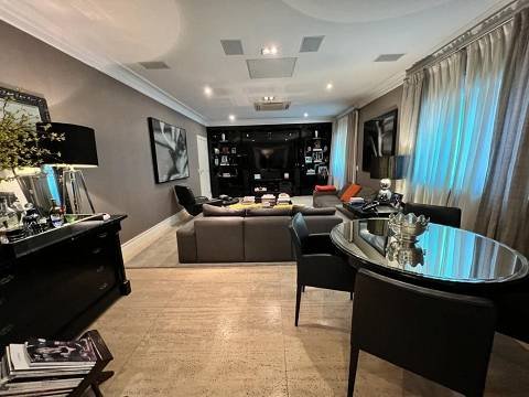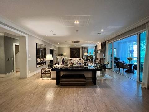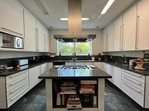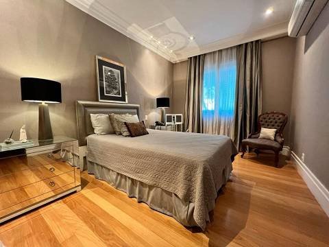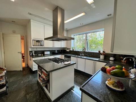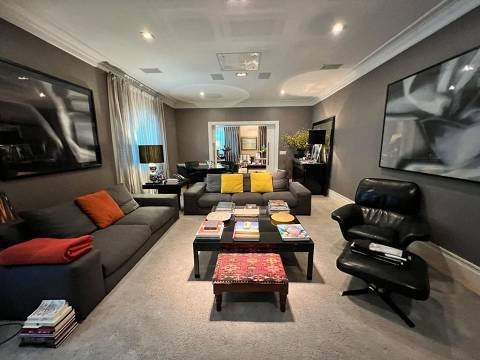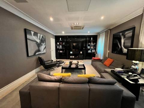 Living integrado com terraço e jardim. São 3 suítes amplas, sendo a master com closet "ele e ela". Conta ainda com 5 vagas de garagem e depósito. A sala de estar é muito espaçosa, com lareira, varanda, home theater e sala de jantar. Copa e cozinha equipadas. A área de serviço possui 2 dormitórios e banheiro.
