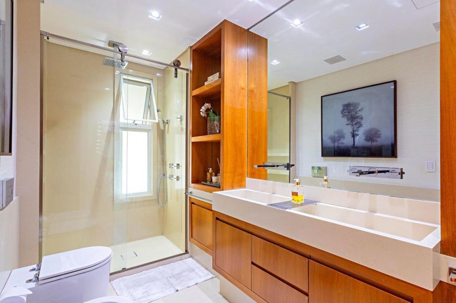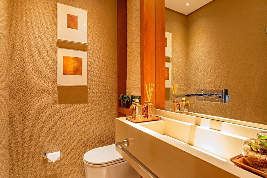 O ambiente conta ainda com escritório integrado, ideal para home office, e lavabo elegante com metais e louças Deca, bancadas e cuba esculpidas em Cesarstone, faixa decorativa Mosarte e espelhos VLA Vidros.