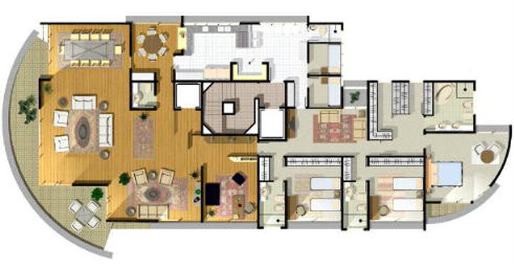 Apartamento de 335,7 m² úteis, em andar alto, com 3 suítes, escritório, e living amplo avarandado para 4 ambientes.