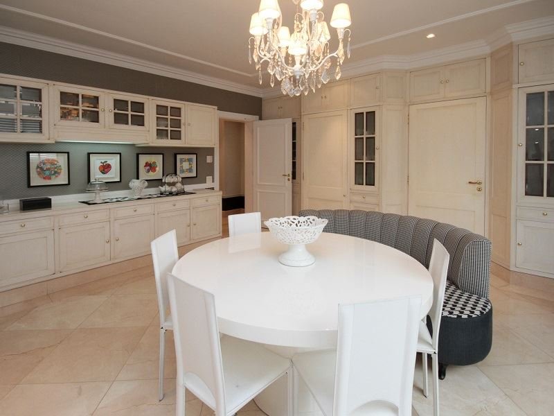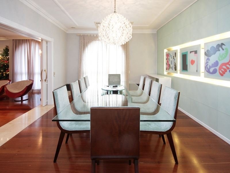 Apartamento de alto padrão à venda nos Jardins, no Jardim Paulista, com 587 m² de área útil. Os espaços sociais são confortáveis e incluem sala de jantar, sala de TV, ampla varanda e cozinha com armários planejados.