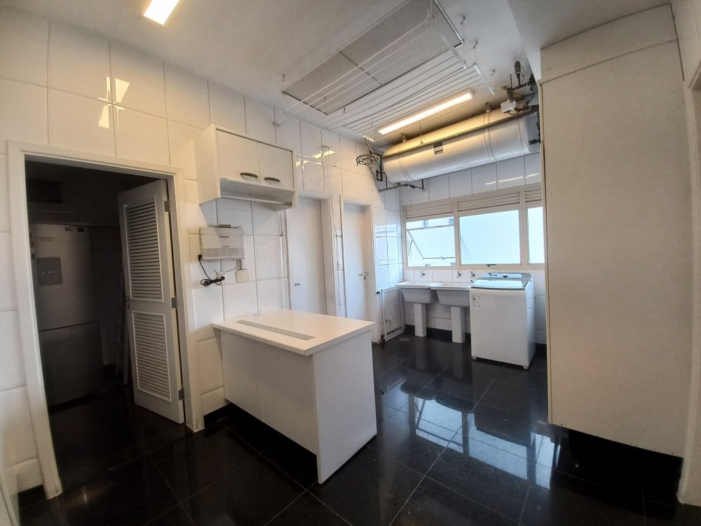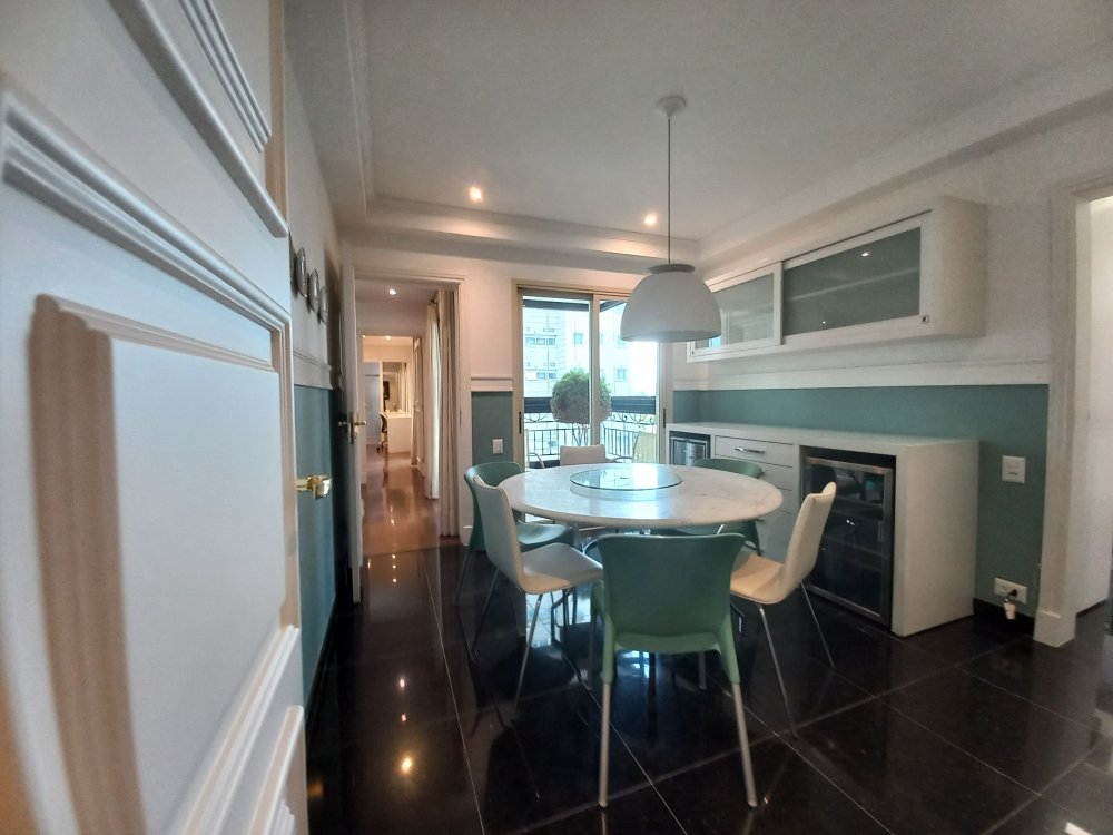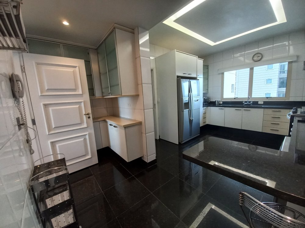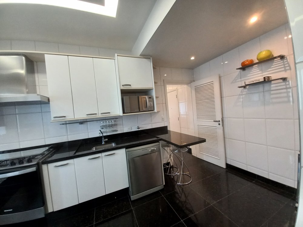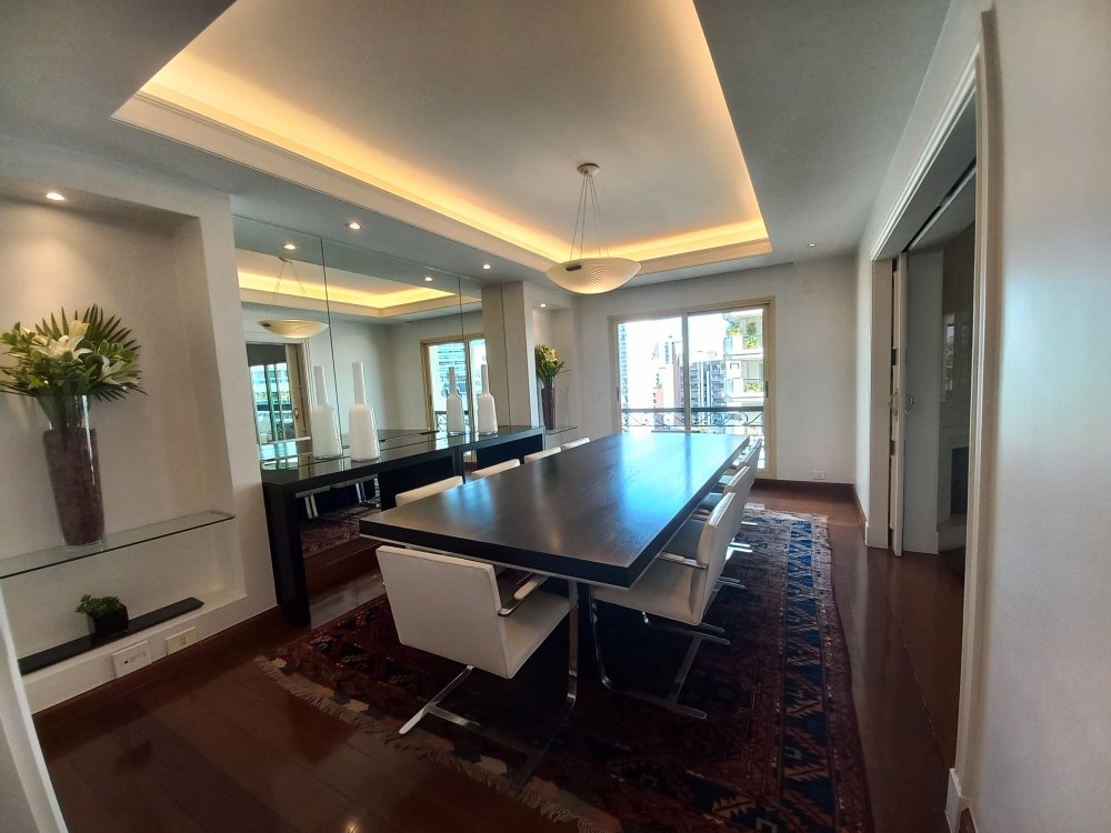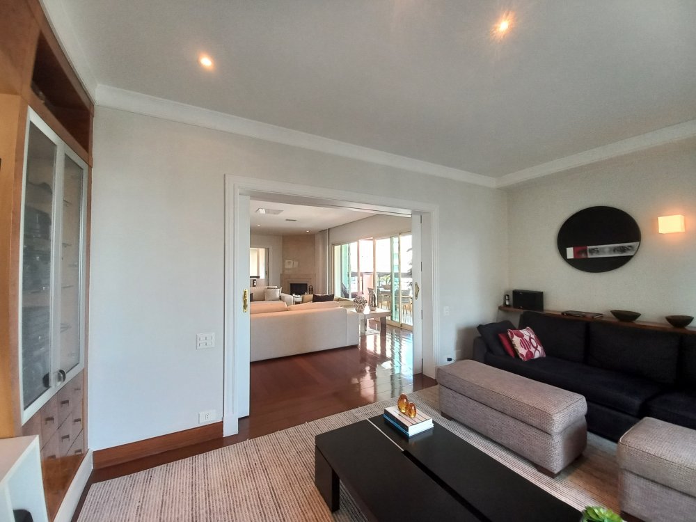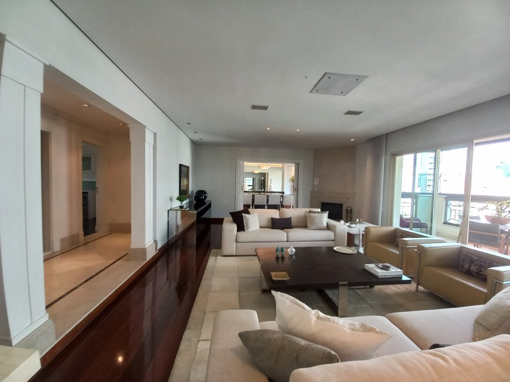 Apartamento totalmente mobiliado disponível para alugar, com uma área útil de 388 metros quadrados. O imóvel possui 4 suítes, sendo que a suíte master conta com uma hidromassagem. O living é espaçoso e oferece espaço para acomodar diversos ambientes, sendo conectado a uma varanda. A cozinha é planejada e inclui uma área de copa. Além disso, o apartamento possui 2 dependências de empregadas com banheiro, bem como 2 depósitos para armazenamento.