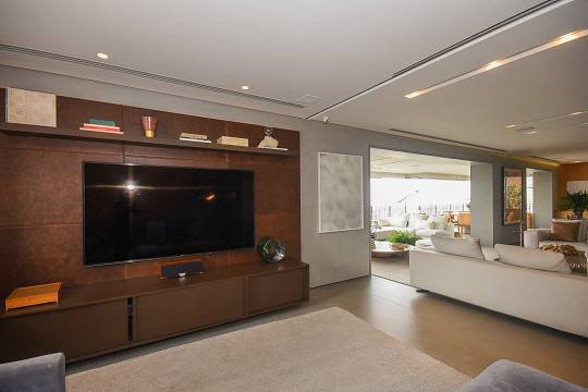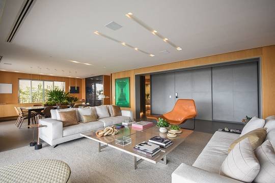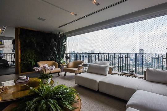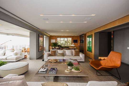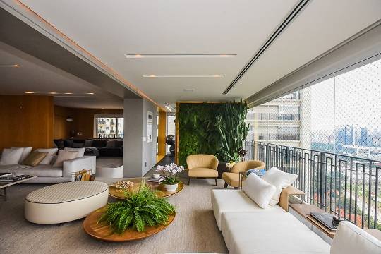 O living foi projetado para acomodar até quatro ambientes distintos, integrando-se harmoniosamente ao terraço com varanda, criando um espaço amplo e elegante para receber.