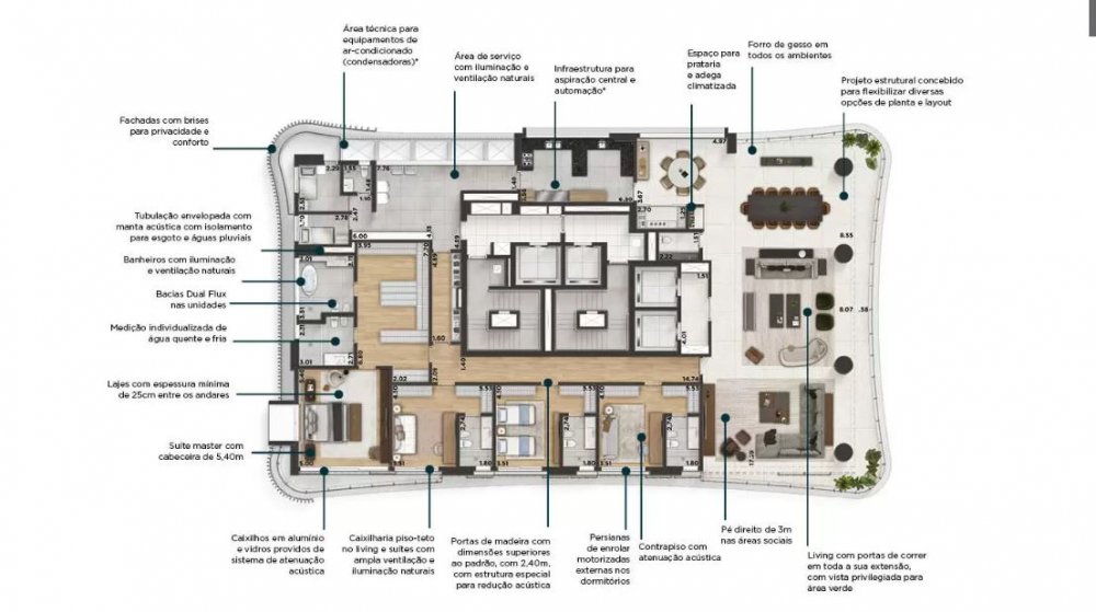 O edifício incorpora soluções tecnológicas avançadas que facilitam o dia a dia dos moradores, como sistemas de automação residencial e infraestrutura para carregamento de veículos elétricos. Além disso, o projeto prioriza a sustentabilidade, utilizando materiais ecoeficientes e práticas que reduzem o impacto ambiental.