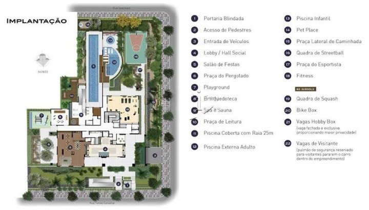 O condomínio com uma infraestrutura completa de lazer, incluindo:,Piscina de raia interna climatizada, Piscina externa, Quadra poliesportiva