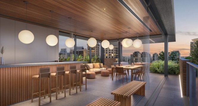 Piscina coberta com deck, Salão de festas, Jardim, Espaço para eventos,Lounge externo, Academia equipada, Sala funcional, Sauna, Playground, Lavanderia e Área para delivery
