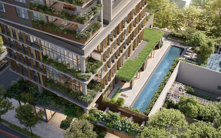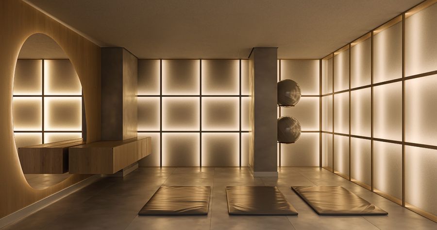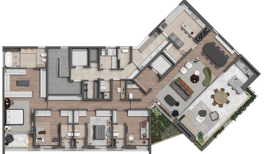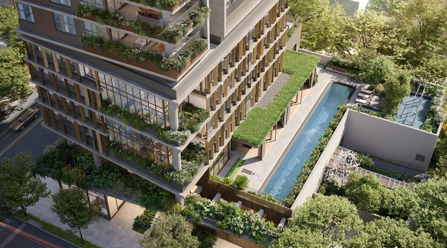 O apartamento tipo possui 340 m² de área útil, com 4 suítes. Há também opção de cobertura duplex com 640 m².