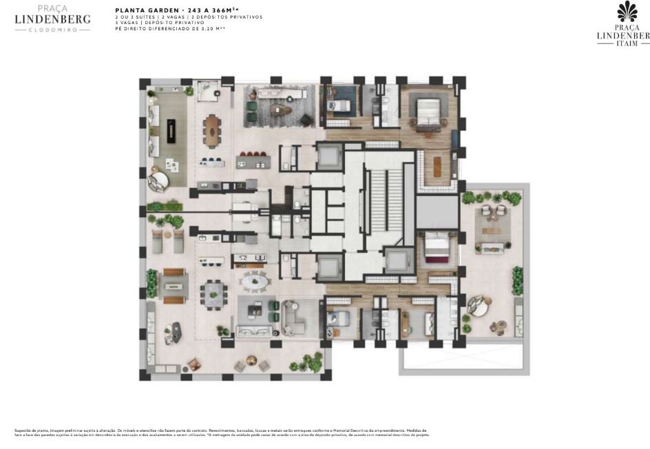 Os apartamentos do Praça Lindenberg Itaim são amplos e personalizáveis, com metragens de 135 m², 154 m² e 191 m², oferecendo opções com 3 a 4 suítes. Há também unidades garden, que variam de 243 m² a 366 m².